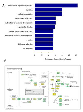图释:A. GO分析结果展示:预测的差异表达miRNA靶基因的前10个富集生物学过程;B. Pathway分析结果展示:预测的miRNA靶基因(黄色标注)富集到的细胞周期相关通路。