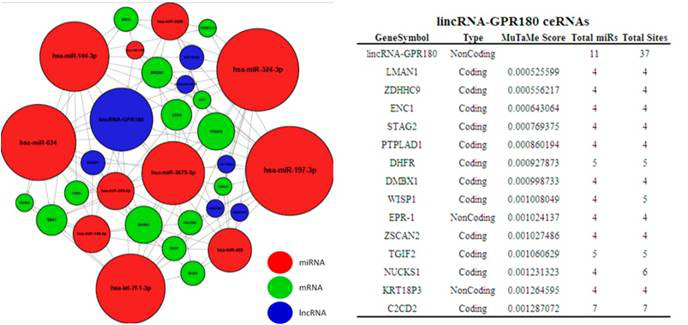 图释:ceRNA分析结果展示。左侧:ceRNA网络图。右侧:针对网络图中的特定lncRNA/hjc黄金城(lincRNA-GPR180)的lncRNA/hjc黄金城-miRNA-mRNA相互作用详细信息。