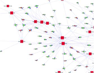 图释:Aksomics miRNA芯片与mRNA芯片联合分析示例:miRNA-靶基因网络图。