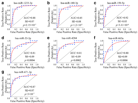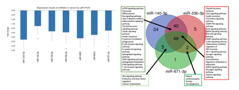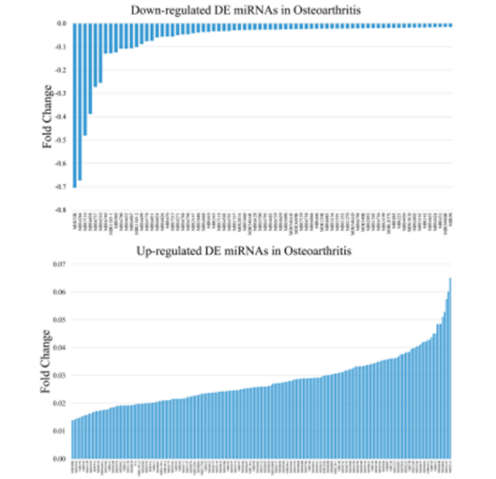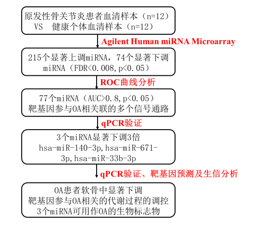 筛选评估原发性骨关节炎(OA)风险和进展的潜在miRNA生物标志物(Serum microRNA array analysis identifies miR-140-3p, miR-33b-3p and miR-671-3p as potential osteoarthritis biomarkers involved in metabolic processes. Clin Epigenetics,2017)