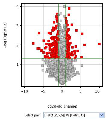 火山图可以对不同样品组之间差异表达的microRNA进行图形化的展示。横轴代表处理组和对照组之间microRNA表达倍数的变化(log2转化),纵轴代表相应的p值(-log10转化)。火山图可以直观的展示microRNA在样品组间的倍数变化与相应的统计学显著性之间的关系(图5)。纵向的绿线分别对应1.5倍的上调(右侧)和下调(左侧),绿色平行线对应0.05的p值。下面火山图中的红色点代表在不同样品组中具有统计学显著性的差异microRNA。