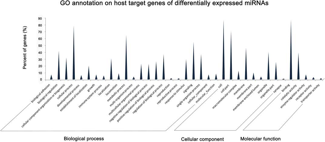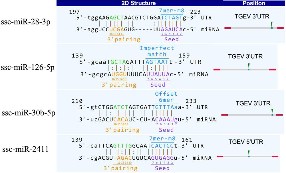 *图释:microRNA靶位点预测及靶基因功能富集。上图:ssc-miR-28-3p、ssc-miR-126-5p、ssc-miR-306-5p和ssc-miR-2411在TGEV基因组上预测的结合位点;下图:差异microRNA预测靶基因的GO注释结果。