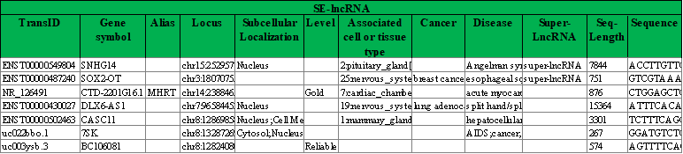 | SE-lncRNA靶基因来源 | 与SE-lncRNA基因组位置重叠或在其转录起始位点50 Kb以内的Refseq基因被收集为SE-lncRNA靶基因。这些基因还包含了来自TF checkpoint数据库中的2883个转录因子基因与来自SBCDDB数据库中的593个癌症相关基因。 |