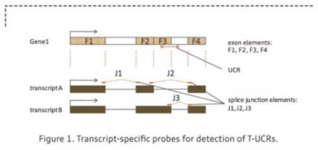 T-UCR可在人多种组织中表达[2],但其表达模式仍然未知。为帮助研究者更准确地研究T-UCR的功能,Arraystar Human T-UCR Microarray收录权威数据库如RefSeq,UCSC,Ensembl预测的153条潜在T-UCRs。可靠的数据来源确保对T-UCR更全面的覆盖。同时hjc黄金城采用了“转录本特异”的探针设计,识别外显子和剪接位点,可以准确检测由一条原始转录本经可变剪切而产生的多个可变剪切异构体(Figure 1)。