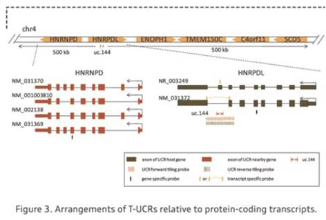 此外,一些T-UCR存在于基因间,作为远端调控或组织特异性增强子从而影响到邻近的蛋白编码基因的表达。为了研究这些mRNA,Arraystar T-UCR芯片采用“转录本特异”的探针设计,可以检测到1809条UCR附近500kb区域的蛋白编码转录本。这些特异性探针的设计,和潜在T-UCR探针一样,可以准确检测由一条原始转录本经可变剪切而产生的多个可变剪切异构体(figure 1)。