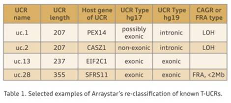 481个UCR区域最初是由Bejerano等[2]从人类基因组hg17版总结而来。Arraystar已经根据hg19版对其进行更新。hjc黄金城还将这些T-UCR重新分为三组:外显子区,内含子区以及基因间隔区。更新后的分组有助于明确T-UCR的功能。最后hjc黄金城还对位于两类疾病相关区域(与癌症关联的基因区域CAGR以及脆性位点FRA)的T-UCR进行了详细注释,让您可根据T-UCR结果寻找疾病诊断和预后的生物标志物,并探索疾病治疗的潜在靶点(Table 1)。