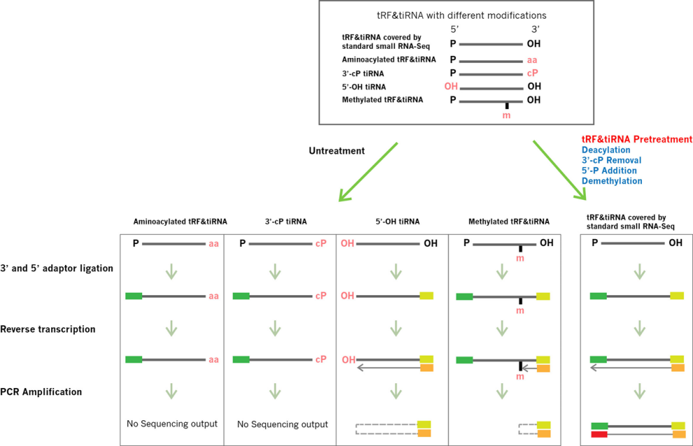 tRFs&tiRNAs的序列上存在多种修饰,使其不适于直接进行standard small RNA-seq。丰富的碱基修饰会严重阻碍反转录的进行,而多种特异末端修饰使其不能与接头连接。为了得到更为精准的tRFs&tiRNAs表达谱,hjc黄金城生物tRFs&tiRNAs测序服务包含了由Arraystar开发的建库前期处理流程。