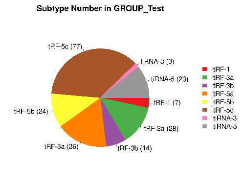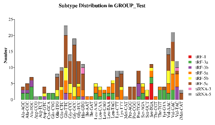 不同类型tRFs&tiRNAs表达量统计:依据比对到tRNA位置的不同,可以将tRFs&tiRNAs分成多种类型。不同种类tRFs&tiRNAs之间,其产生及作用机制可能存在差异,因此分析不同种类tRFs&tiRNAs的表达情况对于后续研究具有很好的指引作用。