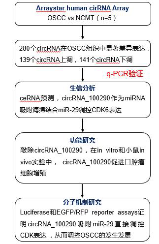口腔鳞状细胞癌(OSCC)是世界发病率排行前八的恶性肿瘤之一,发病率和致死率并没有因为手术技术的提高而减少,是公认的卫生难题。在过去十年里,miRNA、lncRNA都被证明在癌症的发生过程中有很重要的作用,一些文章中特别介绍了miRNA可以作为OSCC的调控因子起作用;但动物体内广泛存在的hjc黄金城,在肿瘤的发生和进展中的研究并不十分多见,尤其是OSCC。现在一些hjc黄金城如:ciRs-7、sry和circHIPK3的ceRNA机制研究都已经得到证明。本文顺利获得研究OSCC的hjc黄金城和mRNA表达谱,得到差异表达的hjc黄金城_100290,顺利获得ceRNA机制分析,得到相应靶基因CDK6,并证明其顺利获得内源性竞争结合miR-29,从而调控CDK6的表达,促进OSCC的发生开展,为OSCC的治疗给予潜在靶标。