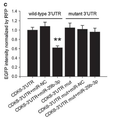 图4:Luciferase和EGFP/RFP reporter assays验证miR-29直接结合hjc黄金城_100290/CDK
