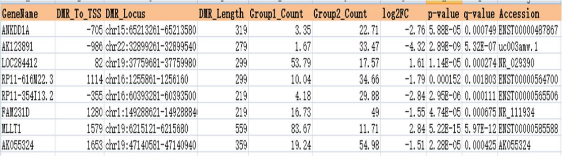 表1:lncRNA启动子差异甲基化区域列表