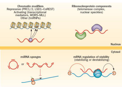 图二 lncRNA作用机制。大部分lncRNA位于细胞核内,招募染色质调控因子到DNA。这些染色质调控因子具有抑制或激活转录功能,或者作为核组织因子发挥作用。一些lncRNA还可与特异性蛋白结合,作为核糖核蛋白复合体的支架。在细胞质中,lncRNA顺利获得吸附miRNA,抑制其对其靶向mRNA的作用。一些lncRNA还顺利获得抑制或增强mRNA的稳定性,从而调节mRNA的半衰期。