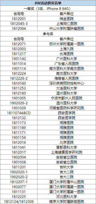 hjc黄金城生物2018年“多组学平台联动,迎年终惊喜钜惠”获奖名单公布如下(排名不分先后,本名单公示期一个月):