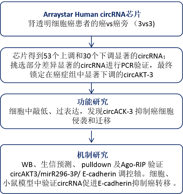 本研究顺利获得Arraystar Human hjc黄金城芯片发现了一个新的来源于 AKT3基因位点的 hjc黄金城,命名为 circ-AKT3,在 ccRCC 组织样本和细胞系中稳定下调。 功能检测表明,cox-3与 ccRCC 细胞的转移呈负相关。机制研究表明,circ-AKT3可能作为 miR-296-3p 的海绵,上调 E-cadherin 的表达,从而抑制 ccRCC 的体外迁移和侵袭以及体内转移,可作为肿瘤转移抑制的治疗靶点。