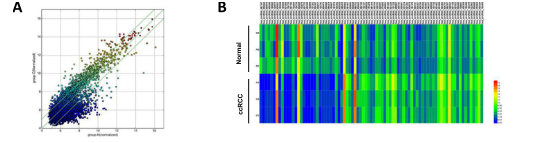 图一:Arraystar hjc黄金城芯片结果展示A.散点图;B.聚类图
