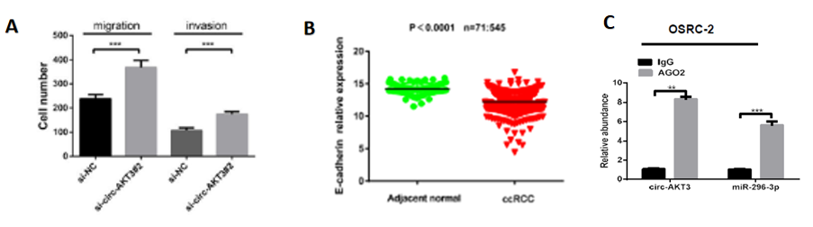 图二:A.circAKT3促进细胞迁徙及侵袭; B. E-cadherin在癌症样本中下调; C. Ago RIP 验证hjc黄金城 与miR-296-3p结合