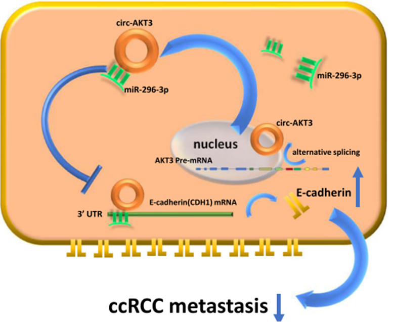 Circ-AKT3 inhibits clear cell renal cell carcinoma metastasis via altering miR-296-3p/E-cadherin signals. Mol Cancer. 2019