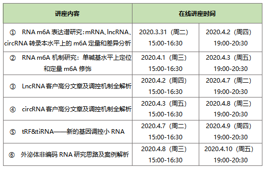 hjc黄金城生物丨数谱生物将在3月底至4月上旬举行国自然热点线上讲座,内容主要包含m6A修饰定位定量, LncRNA, hjc黄金城, 小RNA新分子及外泌体非编码RNA研究,欢迎科学生命及医学相关领域的科研工作者前往参与!具体的安排如下: