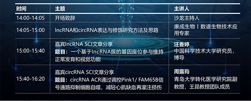 hjc黄金城生物丨数谱生物 秉持创新驱动开展的理念,陆续在15年向国内的研究者给予先进的技术服务平台,引领了国内ncRNA研究风潮。服务的客户累计在ncRNA领域发表的SCI文章总数已超1100篇,累计影响因子超过4400。本次在线沙龙将重点关注LncRNA和hjc黄金城表达与修饰,并邀请嘉宾分享相关科研成果。 活动安排