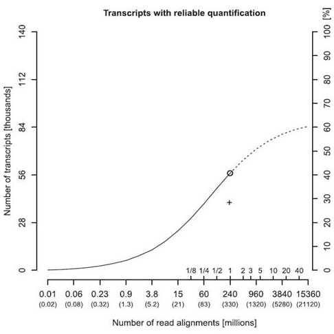 图4.定量可靠(误差低于20%)的转录本数目与测序深度的关系。X轴的带括号数字表示总测序reads数。额外的内部刻度线表示值得测序分析的测序运行数。右Y轴为所有已知的可被可靠定量的转录本的比例。小圆圈表示在完整的测序运行中的reads数(331M reads)。外推的S型曲线表示RNA-Seq能可靠检测的转录本最多只能到60%,即使reads数达到10bn。