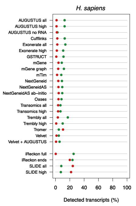 图5.顺利获得RNA-Seq数据进行LncRNA组装的精度很低。图中横轴代表正确组装的转录本占已报道的人类转录本的比例,绿点代表蛋白编码转录本,红点代表非编码转录本(LncRNA)。能被正确组装的蛋白编码转录本不到已知转录本的30%,而能被正确组装的LncRNA比例更低,只有不到20%。