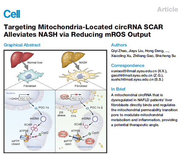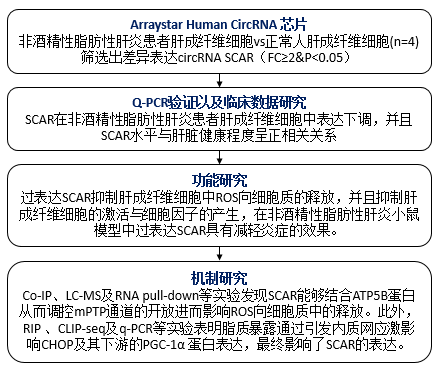 作者利用Arraystar Human CircRNA芯片在NASH患者肝成纤维细胞中找到了影响NASH发生开展的线粒体定位环状RNA分子SCAR,在临床样本验证中发现SCAR的表达与人体肝脏健康程度显著相关。细胞层面上的功能研究表明SCAR与线粒体ROS释放相关,并且能够抑制肝成纤维细胞的活化以及炎症因子的释放,而小鼠模型上的研究则表明SCAR能够减轻肝硬化的表型。最后作者顺利获得一系列的机制实验研究发现,在脂质暴露的情况下出现的内质网应激会导致CHOP及其下游PGC-1α的减少,进而导致SCAR的表达量下降。SCAR的减少会导致原本与其结合的ATP5B转而与CypD结合,从而使线粒体上mPTP通道开放并将ROS释放到细胞质中最终引起NASH。总体而言,这项工作思路清晰,数据详实,具有很高的科研价值与应用价值,为NASH的治疗给予了新的思路与方法。