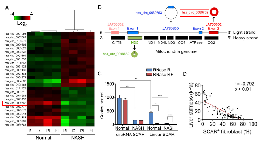 A:差异hjc黄金城聚类图(FC≥2,P<0.05,n=4),在NASH模型病人中找到一个明显下调的环状RNA分子SCAR(hsa_circ_0089762)。B:SCAR对应在线粒体基因组上的位置(以红框标注)。C:Rnase R处理后,Q-PCR验证SCAR的环状结构以及SCAR在NASH患者中的表达情况。D:NASH患者肝脏硬度与SCAR成纤维细胞数目的相关性分析。
