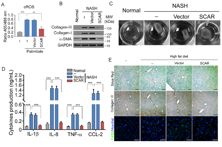 A:正常肝成纤维细胞在使用棕榈酸酯模拟脂质暴露的情况下,过表达SCAR对于细胞质中ROS(cROS)含量的影响。B:Western blot检测过表达SCAR对于NASH患者肝成纤维细胞活化的影响。C:过表达SCAR对NASH患者肝成纤维细胞收缩性的影响。D:过表达SCAR后NASH患者肝成纤维细胞释放的细胞因子总量变化情况。E:在高脂喂养小鼠模型中,过表达SCAR导致肝组织中浸润的巨噬细胞减少。