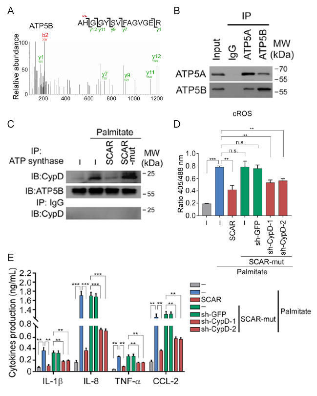 A:RNA pull down以及质谱检测SCAR结合蛋白。B:RIP实验鉴定ATP5B与SCAR的结合情况。C:SCAR影响CypD与ATP5B的结合。D:SCAR与CypD对于肝成纤维细胞的细胞质中ROS释放的影响。E:ELISA检测SCAR与CypD对于肝成纤维细胞释放细胞因子的影响。