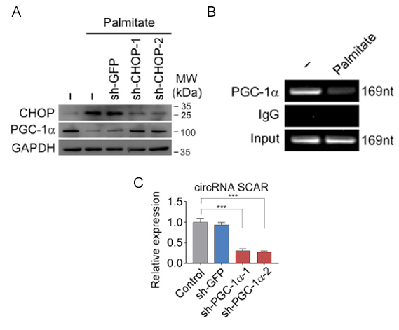 A:棕榈酸酯模拟脂质暴露的情况下,CHOP表达量上升,PGC-1α表达量下降,敲低CHOP蛋白后PGC-1α表达量降低。B:ChIP实验分析棕榈酸酯处理下PGC-1α与SCAR启动子区结合情况。C:PGC-1α敲低抑制SCAR表达。