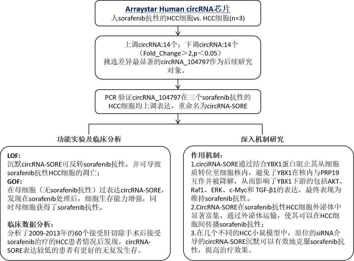 作者成功构建了3个sorafenib抗性的HCC细胞系:HepG2-SR、LM3-SR和 SKhep1-SR,挑选了sorafenib抗性与母细胞表现差异最大的HepG2-SR细胞进行Arraystar hjc黄金城芯片实验,从中鉴定出14个显著上调和14个显著下调表达的hjc黄金城(fc>2,p<0.05)。在这14个显著上调的hjc黄金城中,hjc黄金城_104797的变化最显著。qPCR在3个细胞系中均验证了hjc黄金城_104797的上调表达。因此作者将其命名为hjc黄金城-SORE(a circular RNA upregulated in sorafenib-resistant HCC cells)。