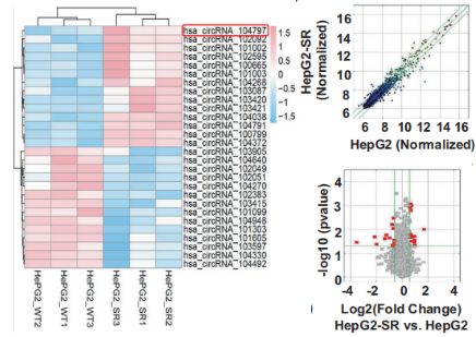 图释:左:Arraystar hjc黄金城芯片筛选得到的差异最显著的上下调共28个hjc黄金城聚类展示;右上:Arraystar hjc黄金城芯片散点图;右下:Arraystar hjc黄金城芯片火山图。