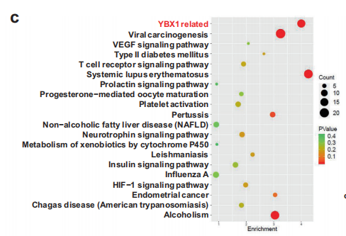 在探究hjc黄金城-SORE在维持sorafenib抗性中的作用机制时,作者先顺利获得实验排除了hjc黄金城-SORE顺利获得调控它的host gene TLE 4 mRNA或蛋白的表达来介导sorafenib抗性的假设,随后把研究重点放到hjc黄金城和蛋白互作上。作者分别用LC-MS/MS实验分析了hjc黄金城-SORE Pull-Down和敲低hjc黄金城-SORE细胞中的蛋白,共鉴定到10个交集蛋白,这些交集蛋白就是既能和hjc黄金城-SOR结合,同时又受hjc黄金城-SORE调控的蛋白。这其中有一个核酸结合蛋白YBX1,在hjc黄金城-SORE序列中有该蛋白的的结合序列(CCAAT)。受hjc黄金城-SORE调控蛋白的KEGG分析也显著富集在一个与YBX1相关的信号通路(见下图)。