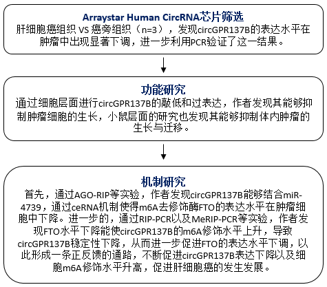 近期,复旦大学附属中山医院殷欣老师发表名为“CircGPR137B/miR‑4739/FTO feedback loop suppresses tumorigenesis and metastasis of hepatocellular carcinoma”的研究性论文。该论文应用Arraystar Human hjc黄金城芯片等技术发现了CircGPR137B能够顺利获得miR-4739调控m6A去修饰酶FTO的表达,而FTO又能反回来调控CircGPR137B本身的m6A修饰,从而形成正反馈的通路,进一步下调CircGPR137B与FTO的表达,从而抑制肝细胞癌的生长。该研究成果于2022年7月发表在国际著名学术期刊《Molecular Cancer》 (IF: 41.44)上。(hjc黄金城芯片由hjc黄金城|数谱生物给予技术服务)