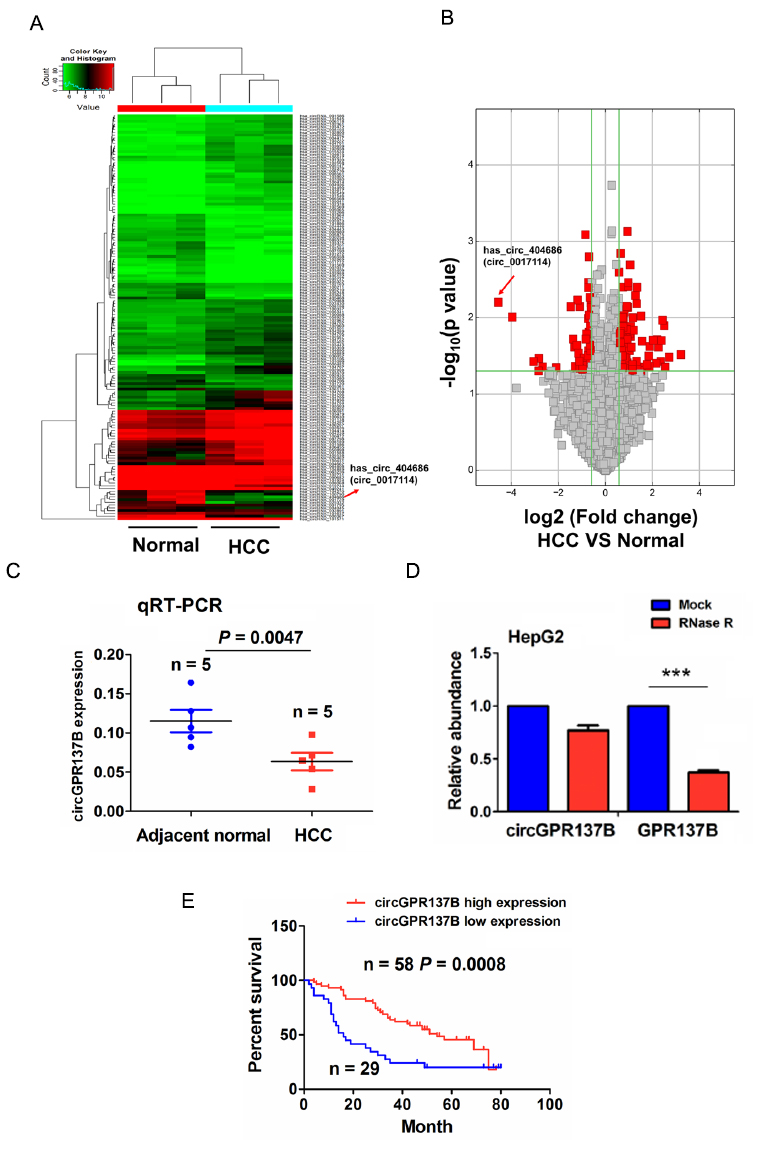 A:聚类图展示差异hjc黄金城的表达情况,发现CircGPR137B在HCC(肝细胞癌)中表达下调。