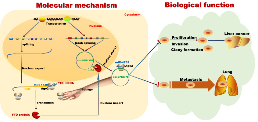 肿瘤细胞中CircGPR137B的表达水平下降能够顺利获得ceRNA机制影响miR-4739,进而下调FTO的表达,增加CircGPR137B本身的m6A修饰水平。这一结果会进一步促进CircGPR137B与FTO的表达量下调,从而形成一条促进HCC发生开展的正反馈通路。