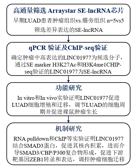 本研究使用Arraystar SE-lncRNA芯片技术研究LUAD中差异表达的SE-lncRNA,并确定上调的LINC01977被SE劫持,促进体外和体内的肿瘤恶性表型开展,具有良好的病理诊断价值。LINC01977可促进肺腺癌细胞的增殖和迁移,并调控细胞周期和细胞自噬进程。文章讨论了LINC01977结合SMAD3并介导其核内积累,在TGF-β刺激下可参与和促进SMAD3/CBP/P300复合物的建立,并导致下游基因ZEB1的表观遗传激活。由于LINC01977高表达的LUAD患者在早期阶段生存期较短、预后较差,而SE-lncRNA作为早期 LUAD 的重要调控分子和治疗靶标具有良好的诊断和治疗潜力,为LUAD的治疗给予了新的思路。