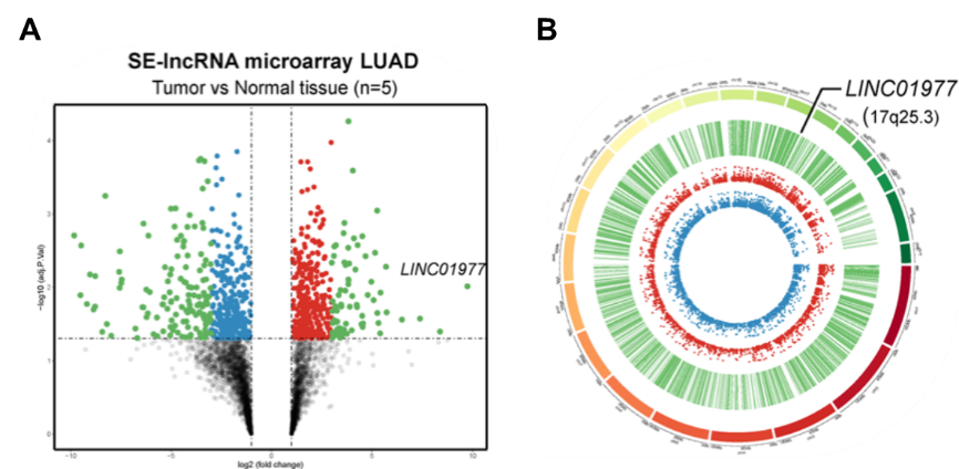 A Arraystar SE-lncRNA芯片结果的火山图显示LINC01977在癌组织表达上调;