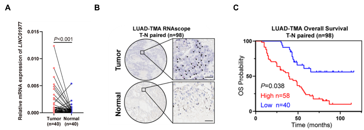 B LUAD癌vs.癌旁组织(n=98)RNA scope原位杂交检测LINC01977表达上调;