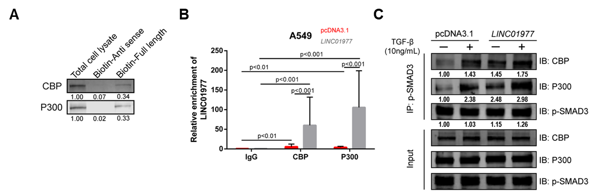 A RNA pull-down验证LINC01977和CBP/P300之间的相互作用;
