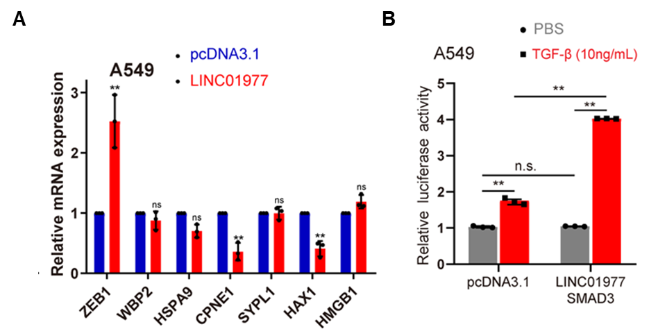 图6:机制研究3,LINC01977在TGF-β刺激下显著提高ZEB1表达水平。
