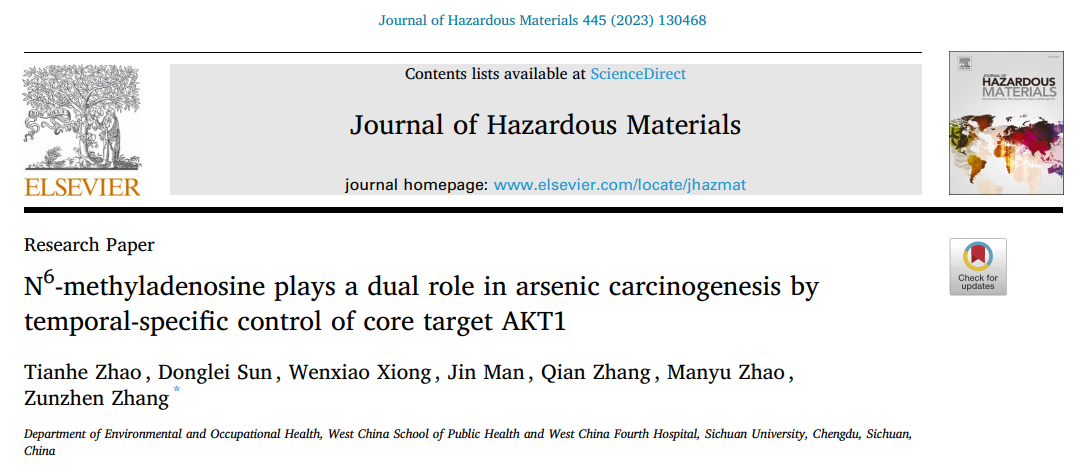 四川大学卫生与环境卫生学系张遵真教授长期从事环境污染物诱发癌症的相关研究,课题组采用Arraystar mRNA&lncRNA表观转录组芯片筛选发现RNA m6A修饰动态调控AKT1的表达和活性,促进砷致皮肤癌在不同阶段的恶性增殖。实验结果显示,关键的癌细胞增殖信号节点AKT1蛋白在砷致癌过程中位于m6A调控网络的中心。该研究成果于2022年发表在学术期刊Journal of Hazardous Materials上,影响因子为14.224(Arraystar mRNA&lncRNA表观转录组芯片由hjc黄金城生物|数谱生物给予技术服务)。
