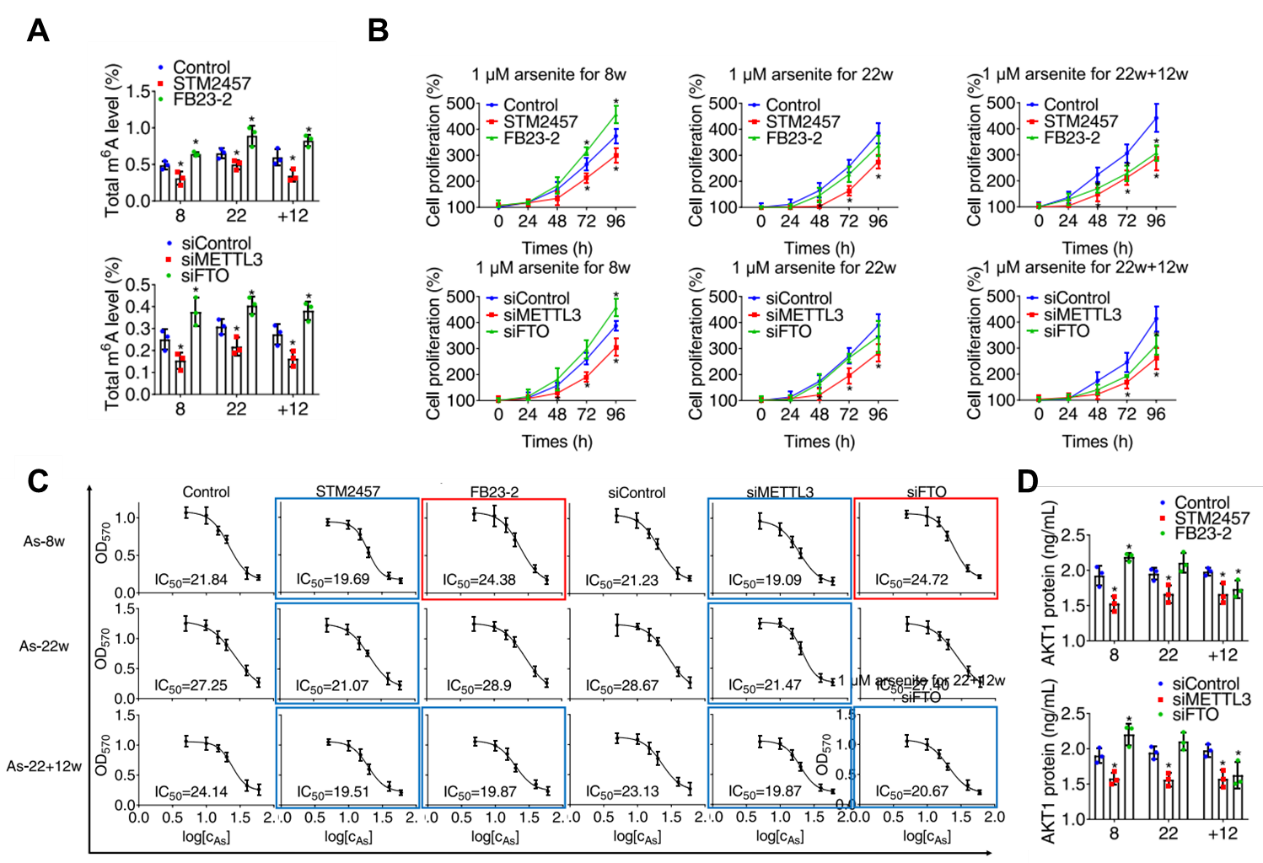 功能研究发现,抑制m6A writer METTL3活性或降低表达后,砷致癌细胞的增殖和存活受到抑制,细胞总m6A修饰、AKT1 mRNA、蛋白质表达降低,而且顺利获得MeRIP-PCR发现AKT1 mRNA特定区域(3'-UTR、CDS和5'-UTR)的m6A水平降低;而抑制m6A eraser FTO使AKT1 mRNA m6A水平提高,但只在早期(砷处理8周)增强了砷致癌细胞的增殖和存活能力,同时使AKT1 mRNA和蛋白质表达增加,对中期细胞 (砷处理22周)没有影响,在晚期则抑制了其生存(砷处理34周),并使AKT1 mRNA和蛋白质表达降低。表明m6A修饰在砷致癌的不同阶段对AKT1的表达和功能发挥重要作用。
