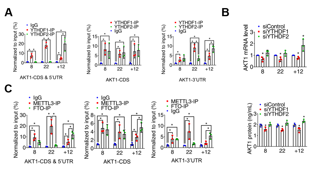 A RIP-qPCR实验验证YTHDF1/2与AKT1 mRNA的结合能力;