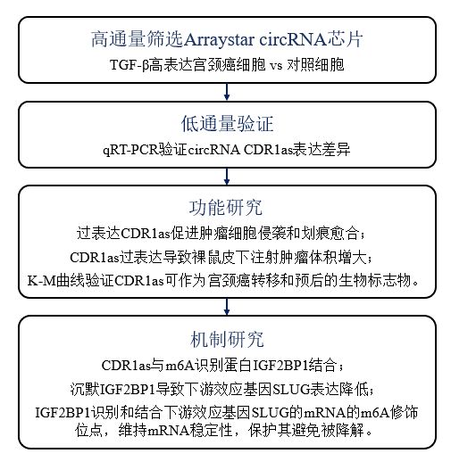 本研究使用Arraystar hjc黄金城芯片在TGF-β诱导的宫颈癌细胞中筛选,发现环状RNA分子CDR1as显著上调。可作为生物标志物预测宫颈癌转移患者预后情况,对宫颈癌转移的诊断和治疗具有良好的理论价值。在实验结果中,作者顺利获得一系列实验表明CDR1as顺利获得结合IGF2BP1蛋白和进一步结合SLUG mRNA的m6A修饰位点,增加该转录因子的mRNA稳定性,从而上调表达水平并最终促进宫颈癌的转移。这些发现深入研究了环状RNA分子CDR1as在TGF-β信号传导通路中的作用,并为宫颈癌治疗给予了潜在的靶点。