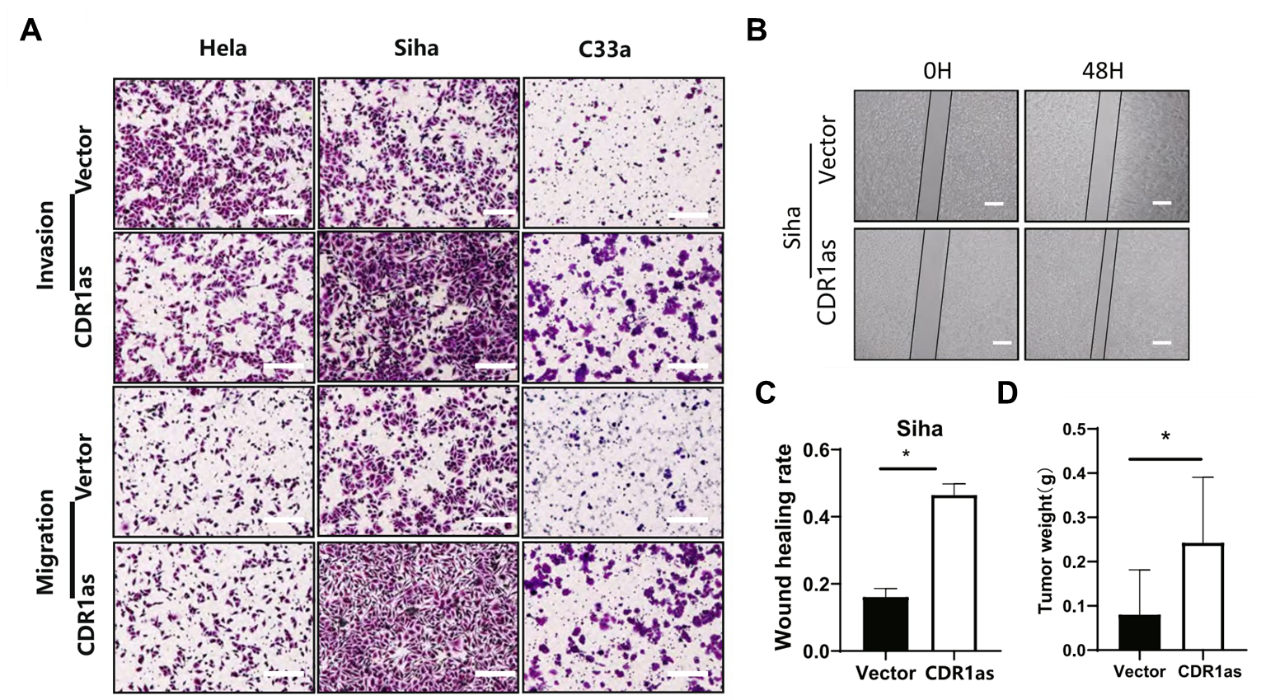 B, C 划痕实验证明过表达CDR1as增强肿瘤细胞Siha的迁移能力;