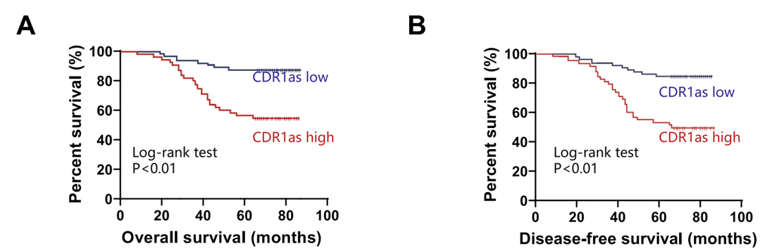 图3:功能研究2,K-M曲线显示CDR1as可作为宫颈癌转移和预后的生物标志物。