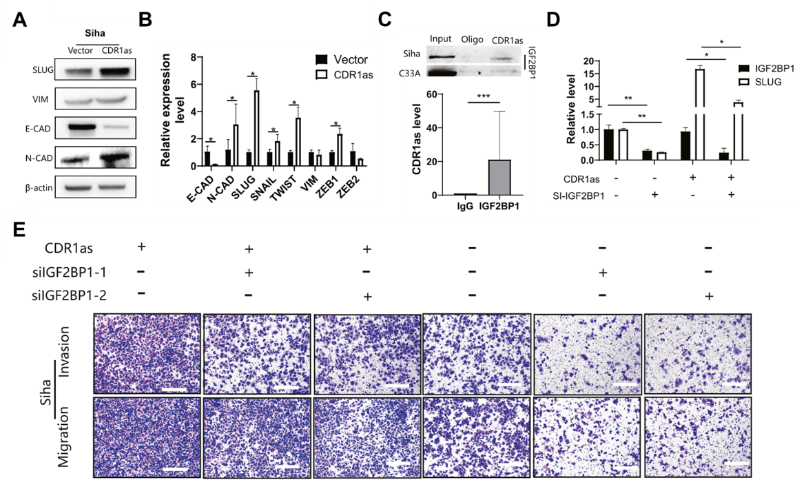 图4:机制研究1,CDR1as结合IGF2BP1蛋白并影响下游SLUG基因的表达水平。