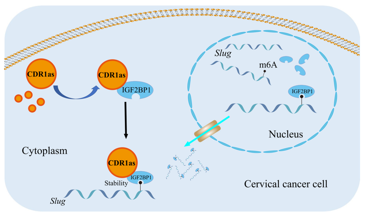 在以TGF-β高表达为标志的宫颈癌转移期,环状RNA分子CDR1as在肿瘤细胞中表达显著升高,并与m6A reader蛋白IGF2BP1结合,进一步介导其与下游基因SLUG的mRNA m6A修饰位点结合,增加mRNA的稳定性,使其避免被降解,使SLUG基因在mRNA和蛋白质水平表达显著上调。最终引起肿瘤细胞迁移和侵袭能力提高、肿瘤组织转移。