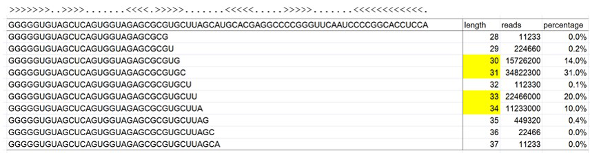图3. 详尽注释的tRF&tiRNA序列、家族、二级结构以及剪切位点